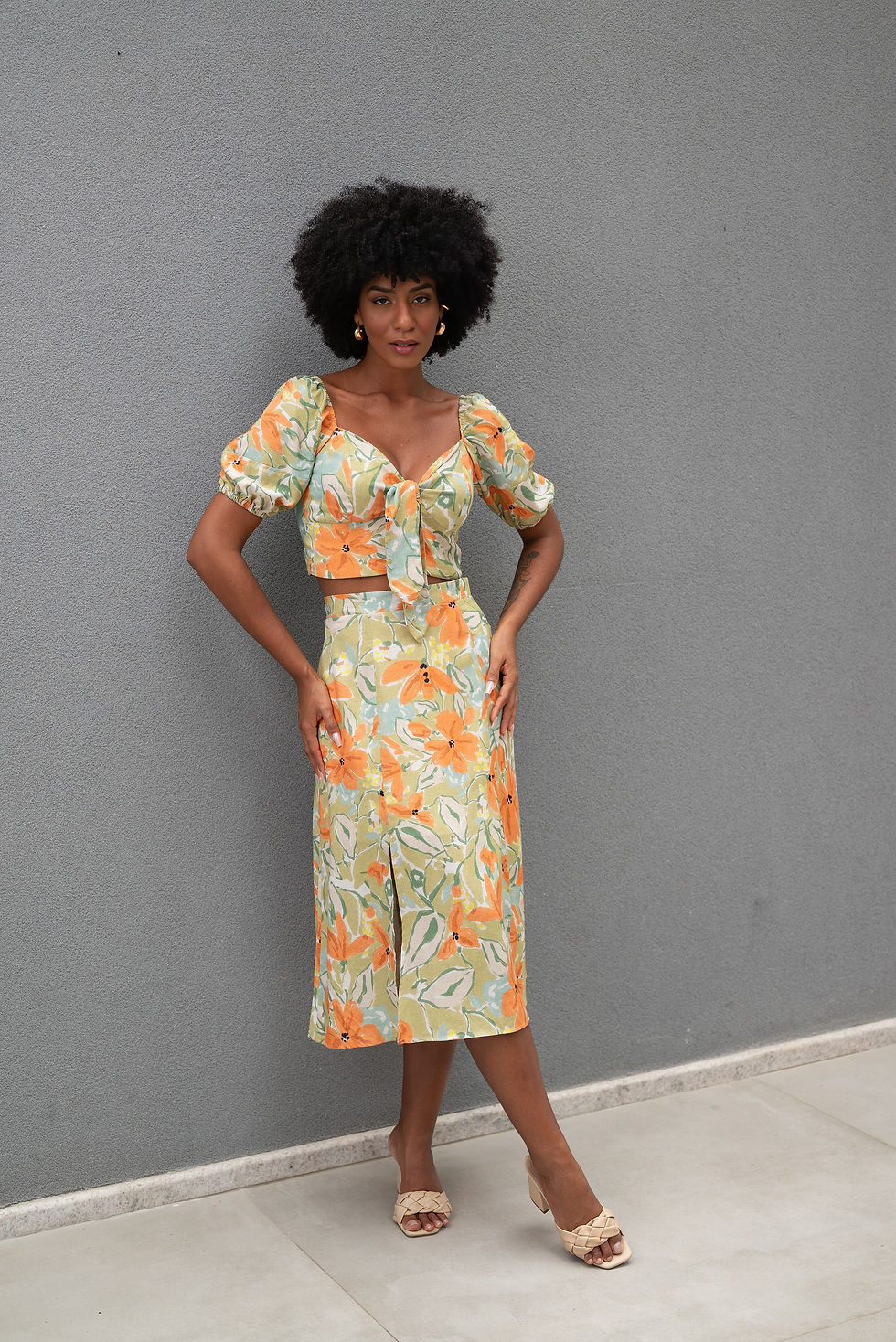 CONJUNTO BLUSA BOTÕES E SAIA MIDI
